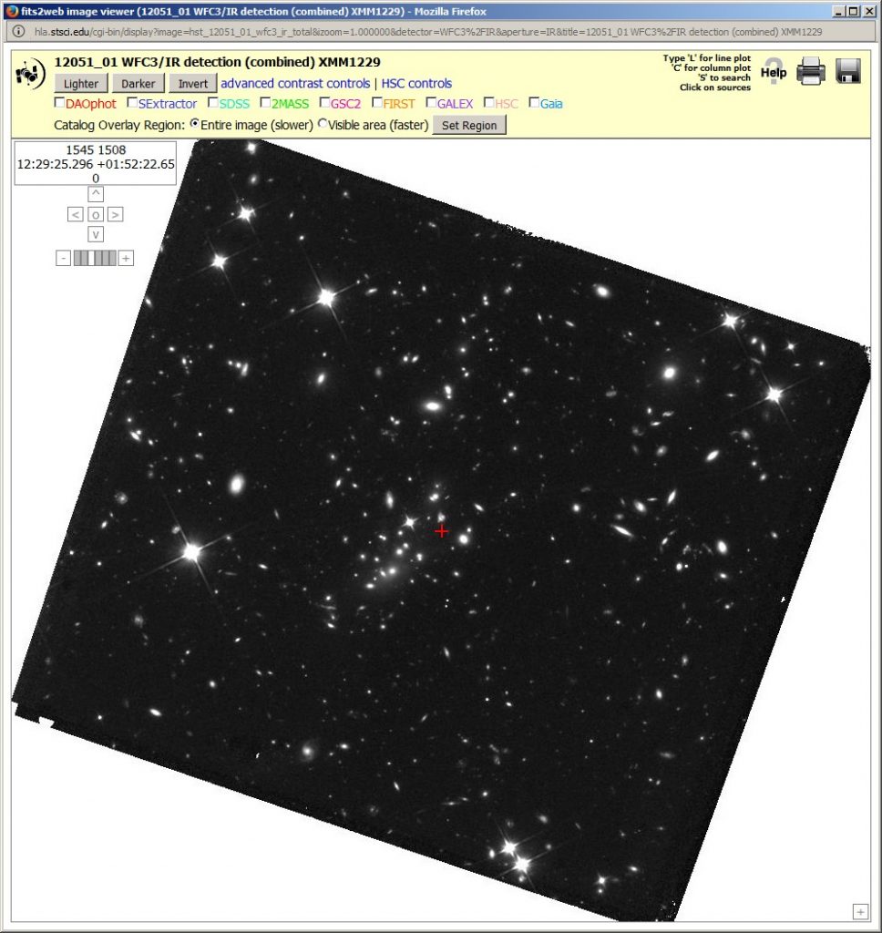 Auf späteren Aufnamen heißt der Haufen XMMU J1229+0151, da er auch mit dem Röntgenteleskop XMM-Newton gefunden wurde. Das folgende Bild zeigt oben rechts des Quasar, links, etwas unterhalb der Mitte das fünfeckige Feld das den Galaxienhaufen enthält.