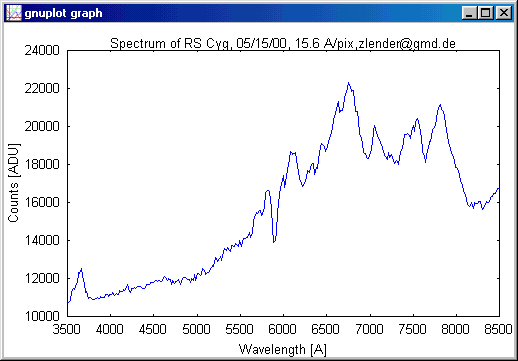 The spectrum below is from WR 136. Date: 05/15/2000, Equipment: 8"/F4.5 Newtonian, ST8-E camera in 2x2 binning mode, 9 images, exptime 45sec, Rainbow Optics grating at nosepiece of camera.