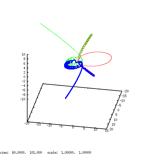 red and m2=0.45, green) and a field star (M=0.77, blue) interact